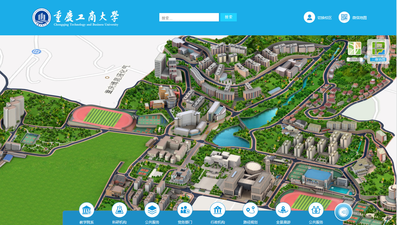 三维虚拟校园系统,以真实校园为整体蓝本(校园布局设计、交通、景观、教学及生活环境、建筑物内外、人文),实现访问者了解学校方位,查找相关建筑的功能,并与节能系统对接,实现能耗的使用查询。