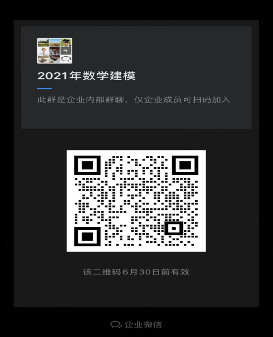 3.凡申请并获准进入“2021年数学建模培训”企业微信群(可扫描二维码进入,二维码附文件末)的同学,视为预报名成功;