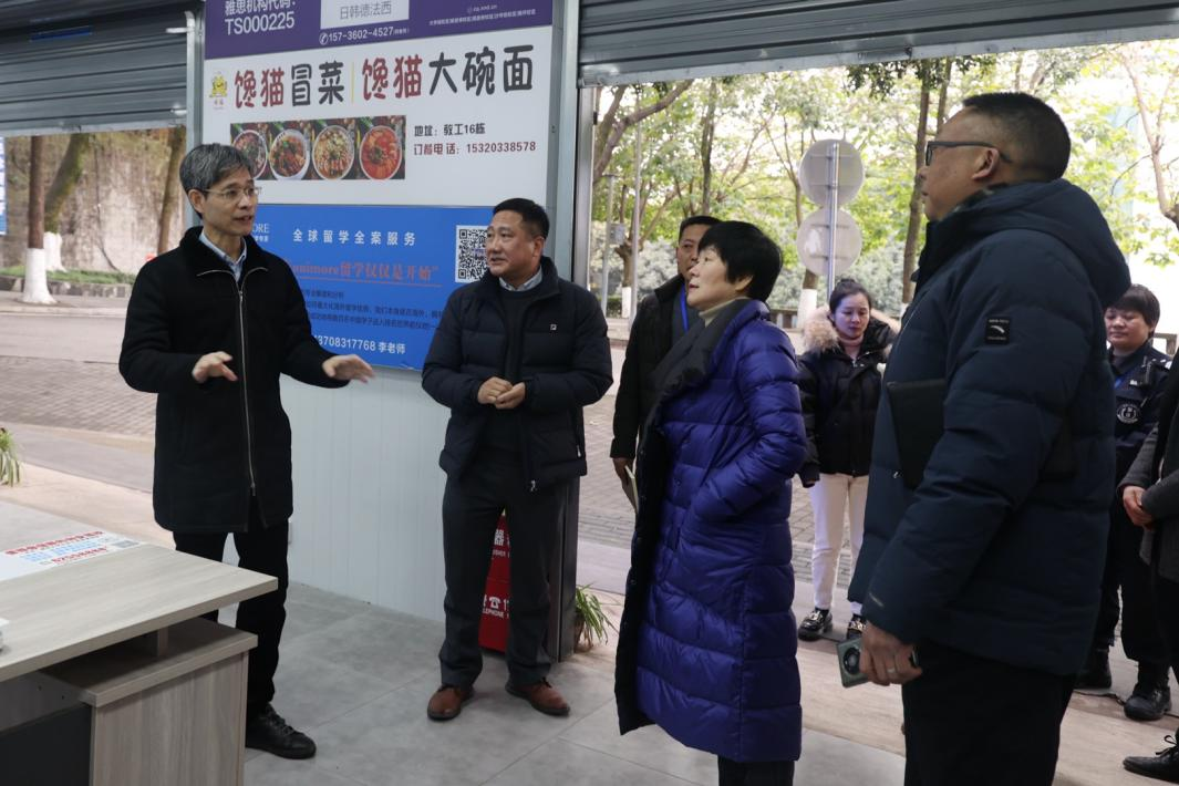 孙芳城一行走进学生公寓,认真查看了学生寝室生活设施和清洁卫生等情况;在学生食堂,检查了原材料采购、环境消杀等方面情况;在快递服务中心,检查开业运营情况;在体艺馆集中核酸检测点,仔细询问了核酸检测工作流程、后勤服务保障、现场秩序维护、防控措施落实等情况。