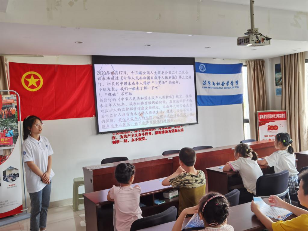 7月6日,法学与社会学学院三下乡实践团走进重庆市沙坪坝区梨树湾社区和南岸区罗家坝社区“青少年之家”,针对青少年群体开展党史学习教育和普法宣传活动。围绕社会主义核心价值观、国家安全观、未成年人保护法、未成人预防犯罪等内容,通过面对面、小范围、互动式宣讲手段助力法治护航青春梦想,携手 “童”行用法治点亮青少年成长路。