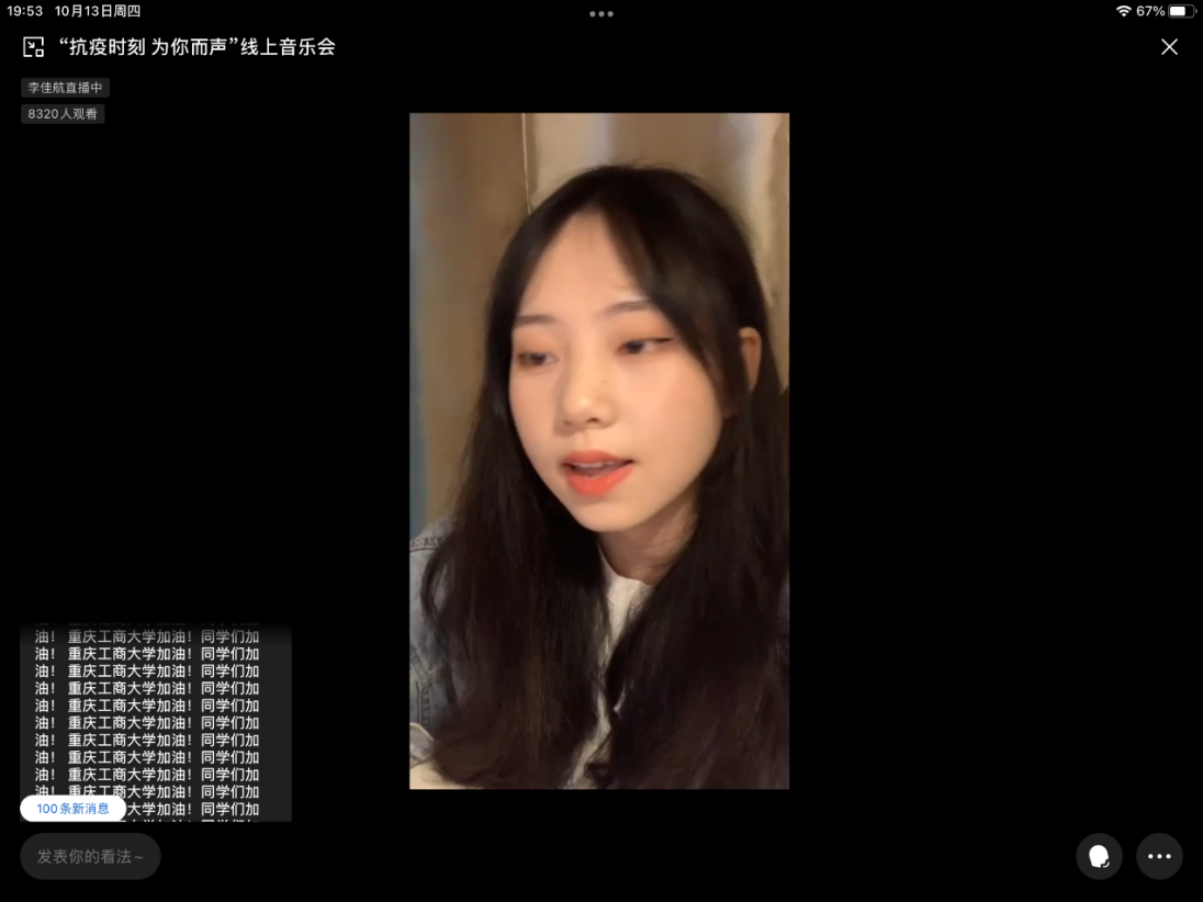10月13日晚19:30,校团委通过企业微信用线上直播的方式举办“战疫时刻,为你而声”线上音乐会。音乐会通过线上演唱与游戏环节相结合的形式,10余名同学用音乐表达对终将战胜疫情的信心,用歌声把温暖和力量传递给全校师生。这是一场特殊的演唱会,同学们在线上隔空聚首,互相鼓励打气,评论区“开元电竞(中国)官方网站加油!同学们加油!”的弹幕文字刷满屏幕,凝聚着大家抗击疫情的坚强信念。本次线上音乐会受到全校师生热烈关注,直播预约人数近9000人,线上观看1.8万余人次,互动留言5.7万余条。