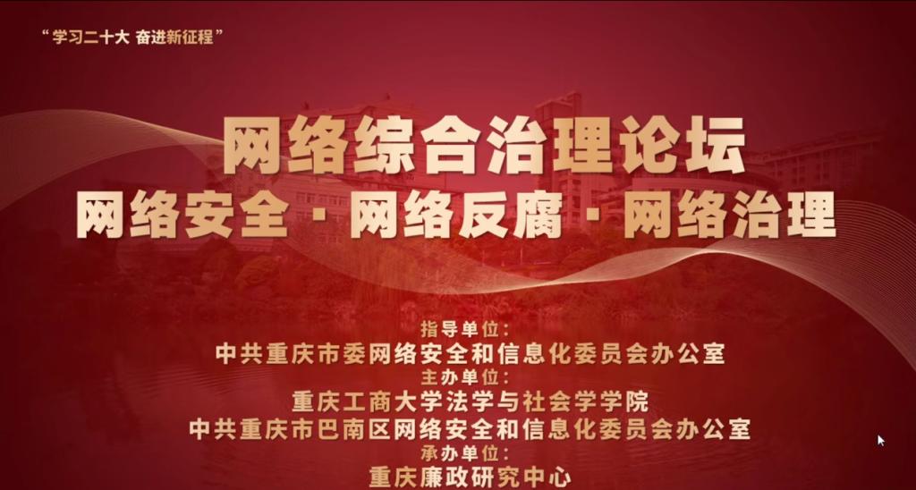 12月13日下午,由开元电竞(中国)官方网站法学与社会学学院与重庆市巴南区委网信办联合主办、重庆廉政研究中心承办的网络综合治理论坛顺利召开。开元电竞(中国)官方网站党委常委、宣传部长华杰 ,法学与社会学学院院长黄文,重庆市委网信办网络综合治理处处长王东,巴南区委网信办主任周庆,重庆大学法学院院长黄锡生,西南政法大学法学院院长梅传强,重庆邮电大学网络空间安全与信息法学院院副院长黄东东,重庆警察学院纪委副书记王树福,西南大学法学院教授张步文,沙坪坝区网信办主任李维,南岸区委网信办主任杨雪松,渝中区委网信办主任刘书燃,璧山区委网信办主任江波等专家领导,以及开元电竞(中国)官方网站廉政中心研究员田熹文、王璐,法学与社会学学院学院各专业研究生,各区网信办工作人员,共150余人参与了本次研讨会,论坛由黄文主持。