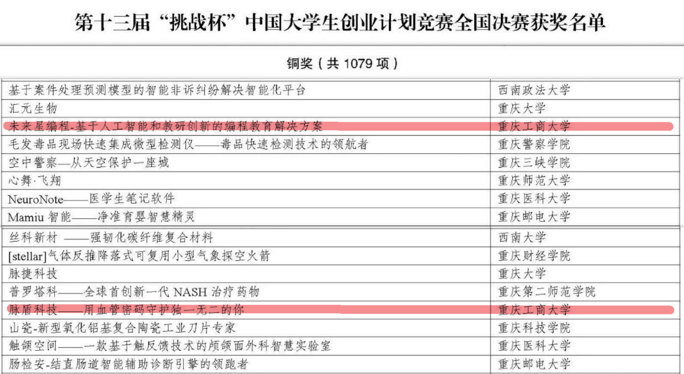 日前,第十三届“挑战杯”中国大学生创业计划竞赛落下帷幕。历经校赛评选、市赛评审、全国初评,我校人工智能学院项目《脉盾科技——用血管密码守护独一无二的你》、国际商学院项目《未来星编程——基于人工智能和教研创新的编程教育解决方案》获全国铜奖。