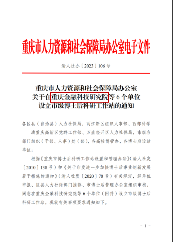 近日,重庆市人力资源和社会保障局印发了《重庆市人力资源和社会保障局办公室关于在重庆金融科技研究院等6个单位设立市级博士后科研工作站的通知》(渝人社办〔2023〕106号),金科院获批设立市级博士后科研工作站,将开展博士后高水平人才招收培养工作。