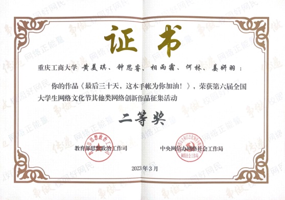由我校党委宣传部石薇琳指导,新闻中心黄美琪、钟思睿、相雨霜、何林、姜妍羽等学生共同创作的参赛作品《最后三十天,这本手账为你加油!》,荣获第六届全国大学生网络文化节其他类网络创新作品征集活动二等奖。本作品首发于学校官方微信公众号,通过手绘+手帐的形式,呈现高三学子高考倒计时30天里的备考生活,旨在为高考学子加油。该作品内容鲜活、富于趣味,引发了广大粉丝的热议与好评。