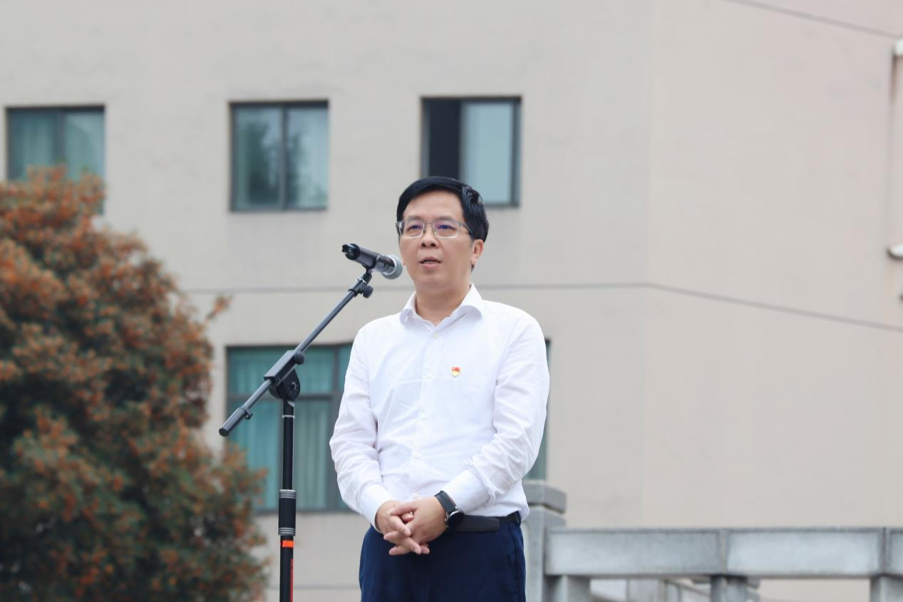 曾维伦在升旗仪式上讲话。他指出,前天大家度过了中秋佳节,昨天迎来了国家第十个“烈士纪念日”,今天学校隆重举行升旗仪式,热烈庆祝中华人民共和国成立74周年。在这个平安祥和、花好月圆的日子里,我们更加怀念70多年前的革命先烈。他们为民族独立、人民幸福、国家富强浴血奋战,用生命和鲜血换来了我们这个伟大民族的涅槃重生,凝聚起实现中华民族伟大复兴中国梦的磅礴力量。