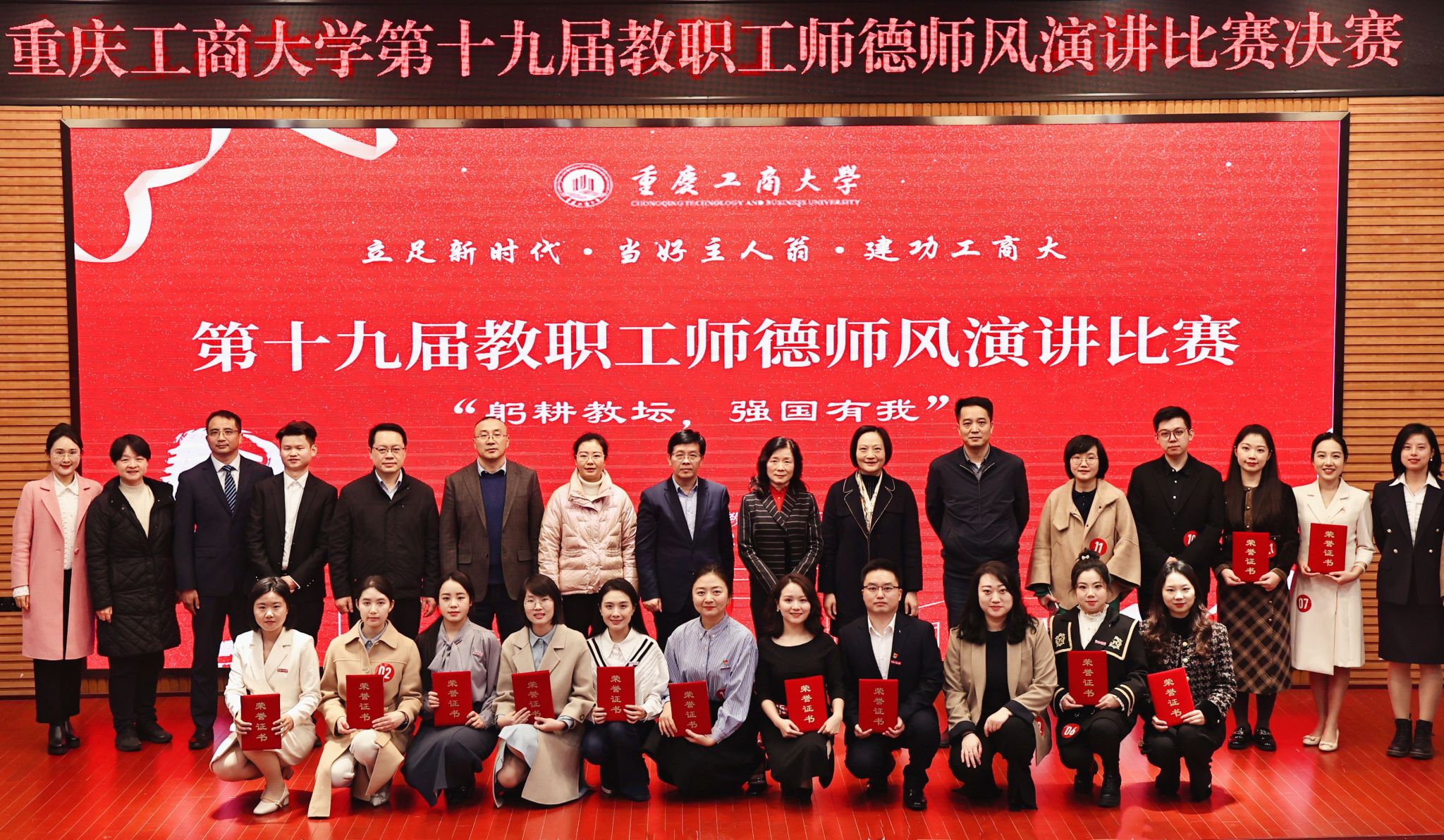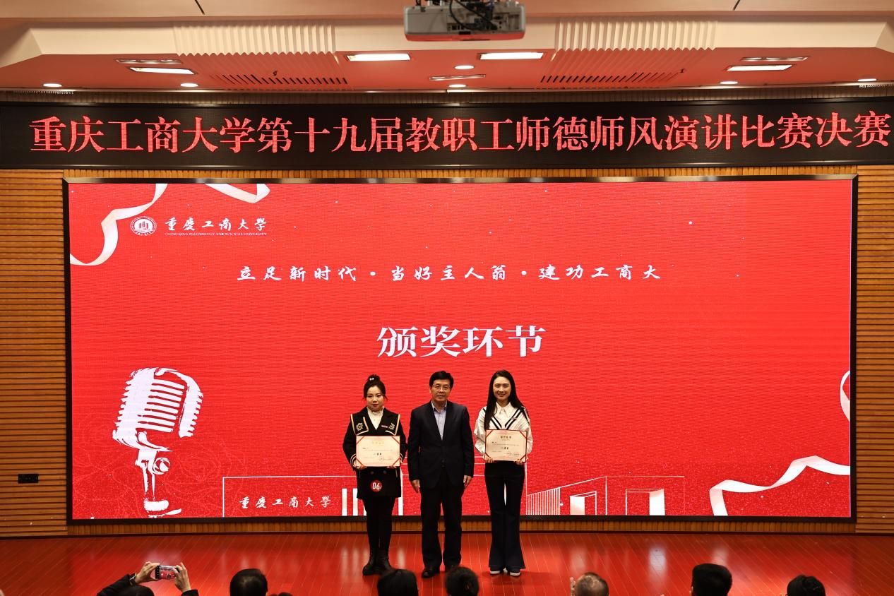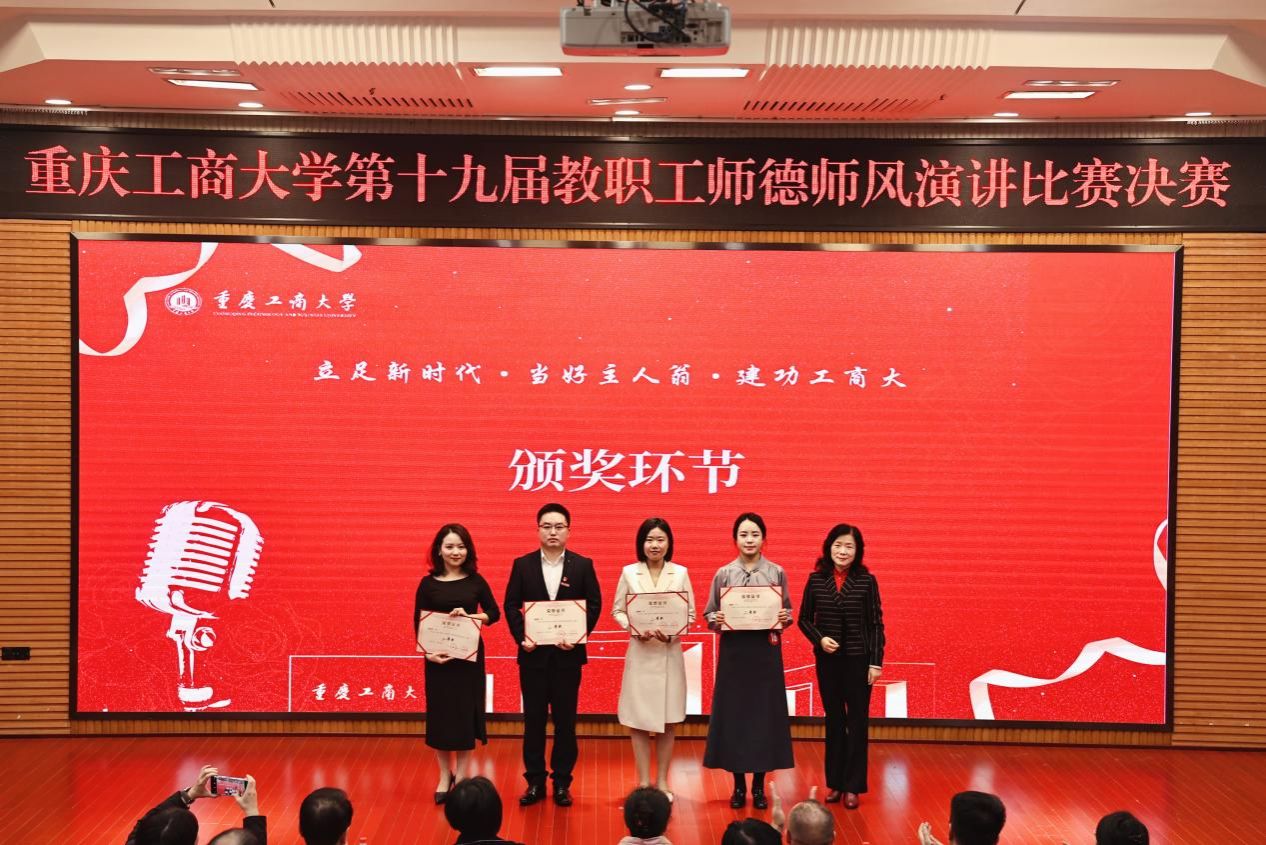 12月1日下午,由校工会、党委教师工作部联合举办的“立足新时代·当好主人翁·建功工商大”系列活动之第十九届教职工师德师风演讲比赛在博智楼7200学术报告厅举行。学校党委书记曾维伦,党委副书记宋豫,学校各学院党委书记、各部门工会主席以及教职工代表共计150余人观看了比赛。比赛邀请了重庆市教科文卫体工会副主席袁菁霞,学校党委常委、组织部部长郑夕春,党委常委、统战部常务副部长陈松,党政办公室副主任、档案馆馆长蒋年韬,党委教师工作部部长、人事处处长林文军,党委宣传部副部长陆嘉,团委副书记胡婧婷担任评委。