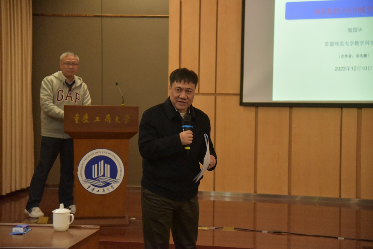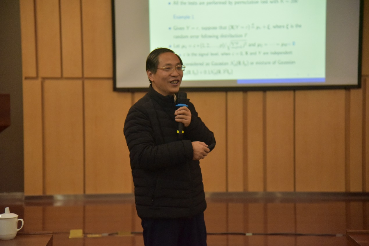 会上,参会专家围绕会议主题做了16场精彩的报告。山东大学陈增敬教授以线上形式作了题为“非线性中心极限定理:多臂机器人和量子游走”的报告;首都师范大学崔恒建教授和邹国华教授分别作了题为“Semi-Distance Correlation and Its Applications”和“有限总体的模型平均估计”的报告;中国人民大学朱利平教授作了题为“非线性相关与独立性检验”的报告。四个报告分别由胡雪梅教授、孙六全教授和陈敏教授主持。 随后,复旦大学张新生教授、北京大学涂云东教授、香港大学李国栋教授、浙江大学张荣茂教授、西北大学夏志明教授、西安交通大学喻达磊教授、长春工业大学王纯洁教授、清华大学李东副教授、浙江大学高照省副教授等特邀嘉宾作了12场特邀学术报告,分别由南京审计大学林金官教授、上海财经大学尤进红教授和福建师范大学陈建宝教授等主持。