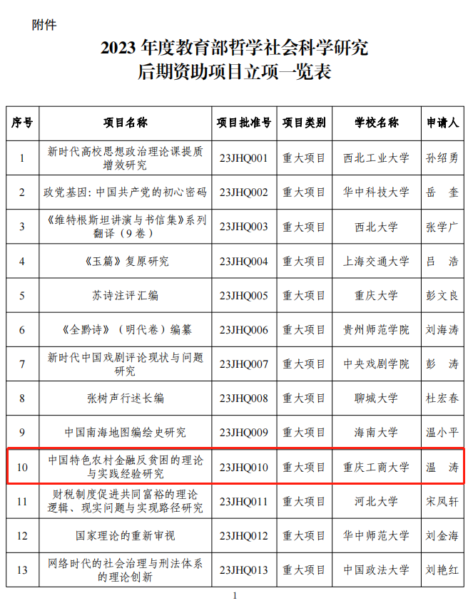 近日,教育部社科司公布了2023年度教育部哲学社会科学研究后期资助项目立项名单。我校温涛教授主持申报的项目“中国特色农村金融反贫困的理论与实践经验研究”获批为后期资助重大项目(项目批准号:23JHQ010)。这是我校首次获得该类重大项目立项。