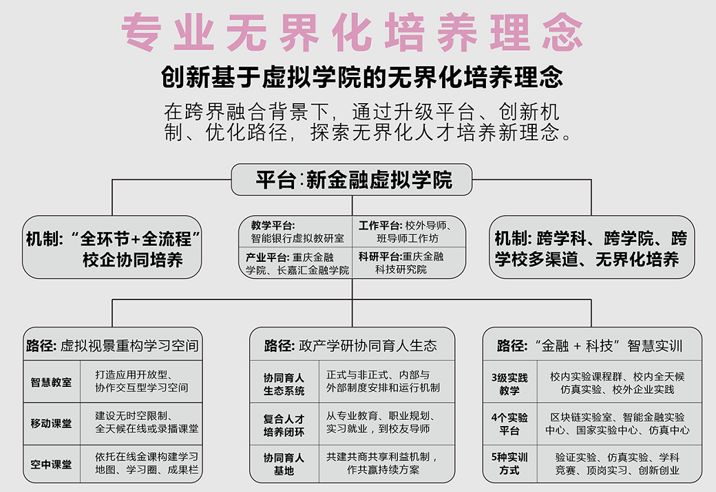 学院聚焦金融行业的深刻变革,以教育部首批新文科研究与改革实践项目《基于“新金融虚拟学院(NewFinancialVirtualCollege)”的金融新文科人才无界化培养模式创新与实践》建设为契机,创新“无界化”人才培养新理念,建立新金融虚拟学院,推动“无界化”商工融合育人从理论到实践的发展。