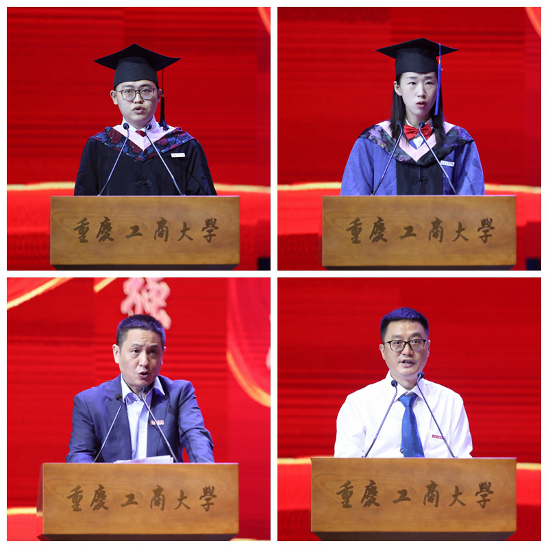 随后,本科毕业生代表李中旭、毕业研究生代表王琦同学分别作了发言。他们表达了对辛勤付出的父母、以身作则的老师、真诚友爱的同学的不舍和感恩之情,并表示将带着重工商大“含弘自强,经邦济民”的精神,在人生未来的道路里不懈奋斗,砥砺前行。1995级检测技术及仪器仪表专业优秀校友、重庆如泰科技股份有限公司董事长印强作为杰出校友代表发言。他结合自己的切身体会,勉励毕业生们规划自己未来的路,坚定走好当下的路,也不要忘记来时的路。来自经济学院的教师代表孙建老师表达了对同学们殷切的希望,希望同学们在更加广阔的天地中展现重工商大学子的家国情怀和浩然正气。