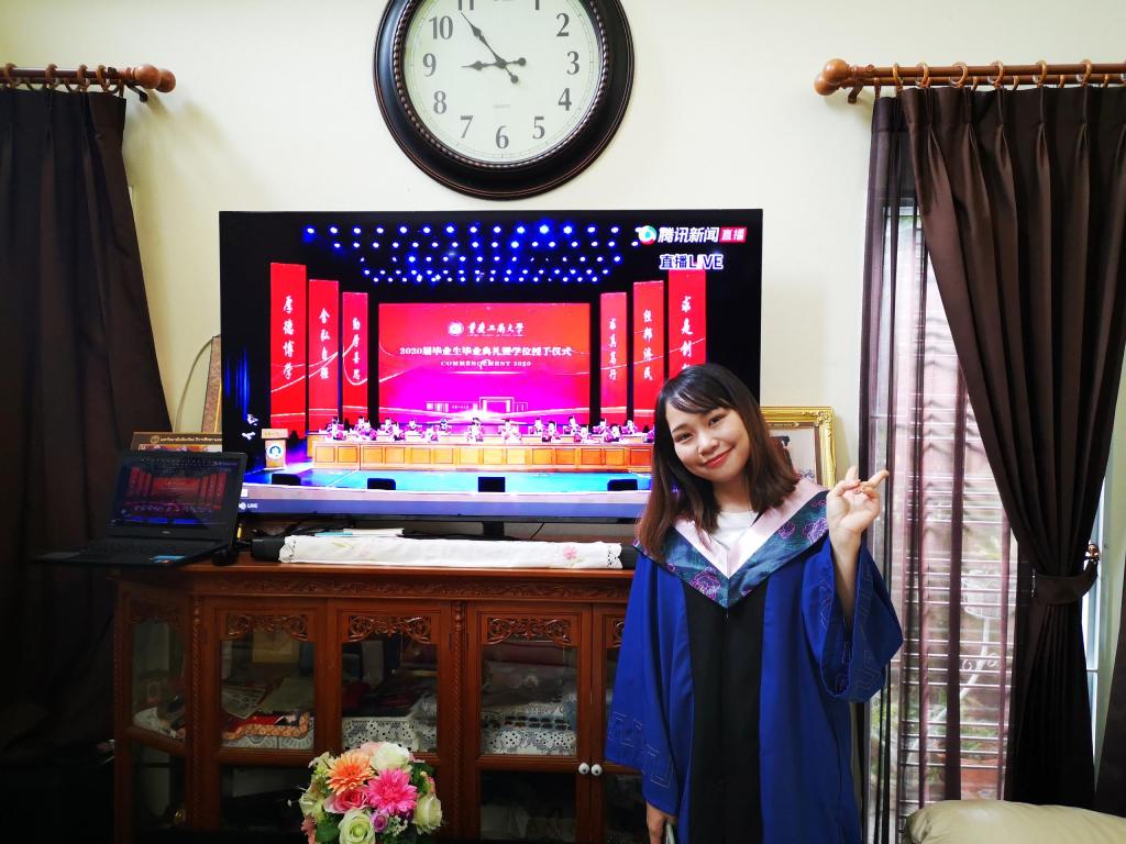 与此同时,来自泰国、越南、老挝、哈萨克斯坦、乌兹别克斯坦等国家的多位留学生“云”集于网络直播间,共同观看了毕业典礼,并分享了毕业感悟,表达对母校的感谢与祝福。我校越南籍国际经济与贸易专业本科生文财今天特意向公司请了假,专心观看毕业典礼。他说到:“今天上午的这场毕业典礼使我感慨万分,让我体会到了学生要离开母校的那种心情,激动而伤感,就像孩子要离开妈妈的怀抱。在开元电竞(中国)官方网站学习的这几年,成为我一生中最重要的财富。感谢老师们对我的培养、支持与照顾。”来自泰国的企业管理专业研究生邱丽芳更是在家里穿着学位服观看了毕业典礼,仪式感十足。开元电竞(中国)官方网站对他们来说,早已不是路过的风景,而是实实在在温暖的家!
