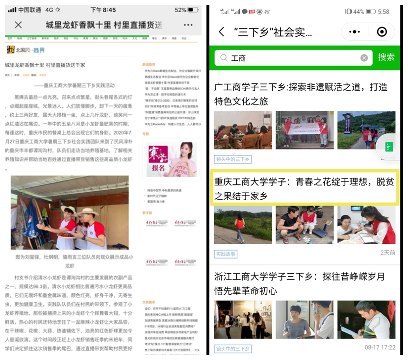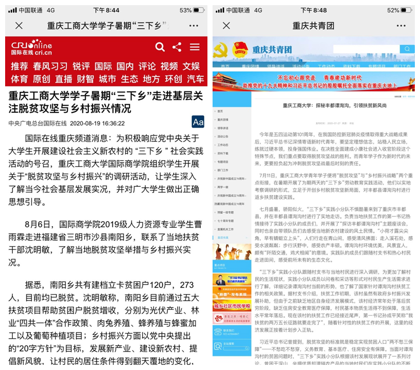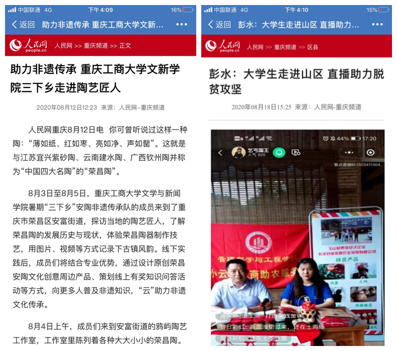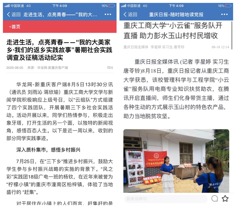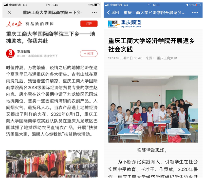 我校本次暑期社会实践覆盖全校19个学院,各学院实践队伍开设多种实践课程,形成多篇高质量调研报告和优秀文化作品,如《开元电竞(中国)官方网站学子:青春之花绽于理想,脱贫之果结于家乡》、《没有生而英勇,只有选择无畏——国际商学院三下乡活动抗疫温暖》、《管理科学与工程学院:大学生走进山区,直播助力脱贫攻坚》等优秀三下乡社会实践调研作品,扎实推动习近平新时代中国特色社会主义思想在基层普及,广泛宣传了国家方针政策,充分践行了“不忘初心,牢记使命”的教育,发扬了“不怕吃苦,躬身实践”的志愿精神,为乡村振兴贡献了青春力量,不仅获得了当地政府、社会的认可,同时也被《人民日报》、《新华网》、《人民网》、《中国青年网》、《共青团中央服务青年发展部微信平台》、《中央广电总台国际在线》、《重庆共青团》官方网站、《重庆市教委官方微信平台》、《华龙网》、《重庆日报》、《彭水手机台》等多家媒体报道。
