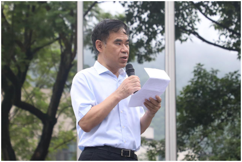 升旗仪式完毕后,学生代表、会计学院2018级财务管理专业、湖北武汉籍学生贺心怡发言。她讲述了在武汉抗疫中的感悟,表示家国情怀是将我们所有人凝聚在一起的朴素的行为和情感,家国是伟大的信念和力量。接着,国际商学院2018级国际经济与贸易一班的刘星驿同学发言,他讲述了自己在重庆防汛抗洪中义无反顾加入南滨路清淤志愿队的故事,他表示责任在肩,义不容辞,当国家和人民需要我们的时候,就应该勇敢的站出来,扛起属于青年的那一份责任。