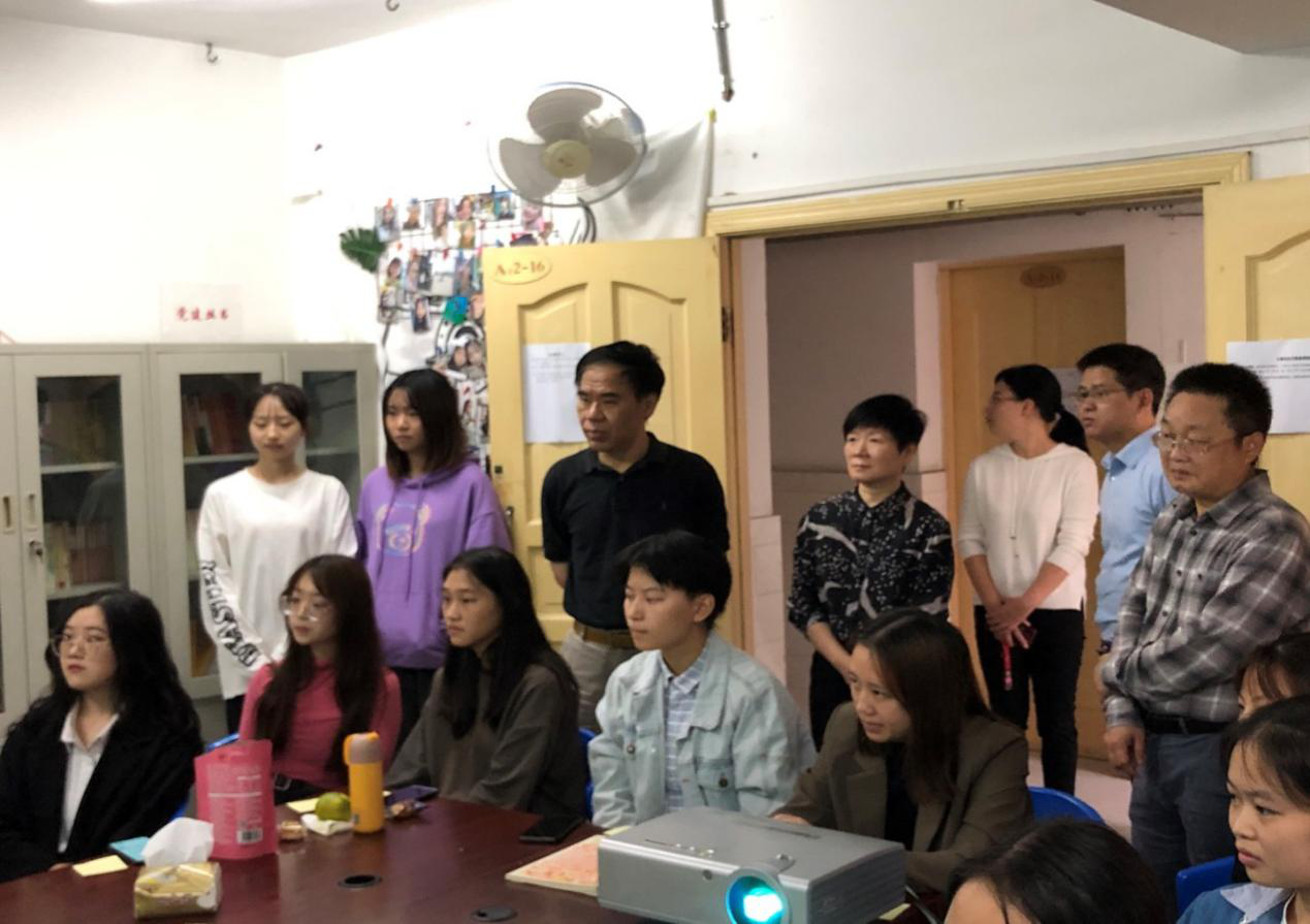 校领导一行来到南区学生公寓时,外国语学院党员服务站正在组织部分留宿学生开展国庆中秋主题活动。在同学们朗诵毛泽东的《沁园春•雪》后,李志雄即兴给同学们介绍了诗词写作的背景,勉励大家要响应习近平总书记号召,奋发图强、不忘初心,接过时代接力棒,砥砺前行。在场同学备受鼓舞。