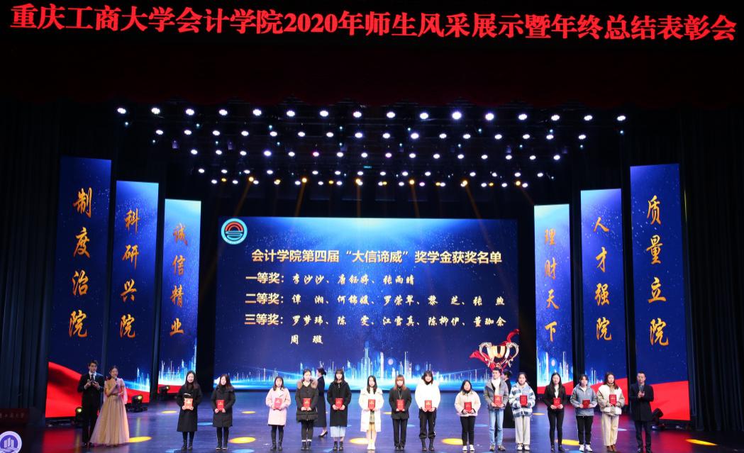 为加强会计学院师生凝聚力,深入学习贯彻党的十九届五中全会精神,把握“十四五”时期经济社会发展的六大“新”目标,创新引领发展的人才工作载体,建设符合国家发展要求的人才培养方式,乘势而上,会计学院于12月18日下午在图书馆大剧场隆重举行会计学院2020年师生风采展示暨年终表彰会。出席此次表彰大会的有校党委书记李志雄、副书记宋豫,副校长陈兴述,党委学工部部长申卫东、教务处处长骆东奇、研究生院院长田双全、财务处处长莫云、教学质量监督与评估办公室主任曾晓松、党委组织部副部长于频、党委学工部副部长尹建平、招生就业处副处长王静、校团委副书记胡婧婷、优秀校友代表张辅辙、徐国富,会计学院班子成员、全体教职工和学生代表。