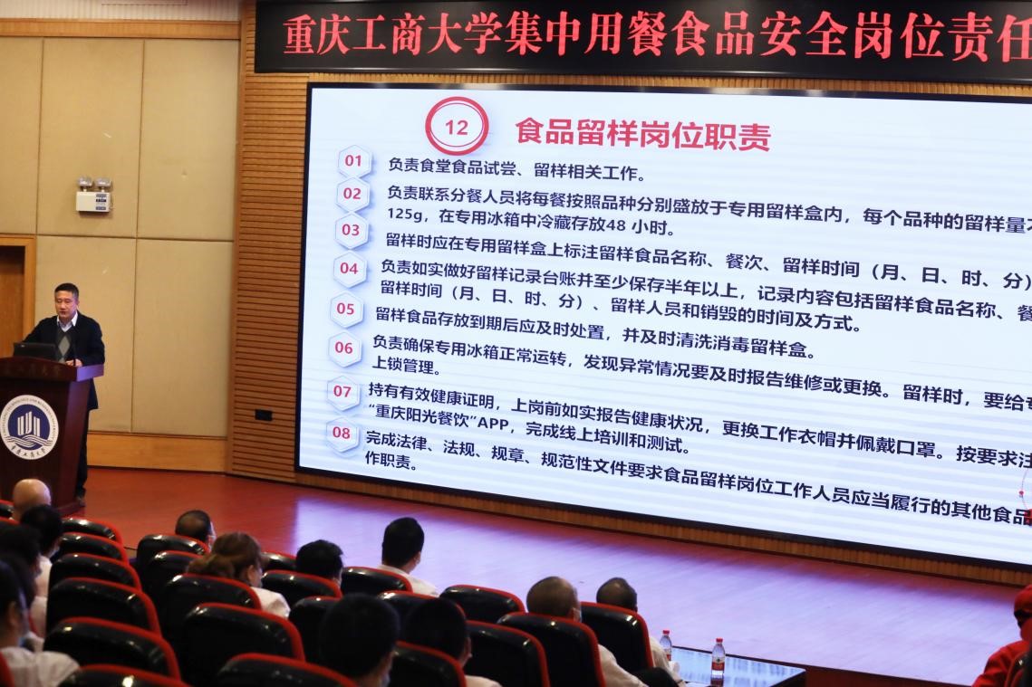 为保障学校师生食品安全,健全食品安全管理制度,明确食品安全工作责任,加强食品安全管理,根据《重庆市市场监督管理局 重庆市教育委员会关于建立学校及幼儿园集中用餐食品安全岗位责任制度的通知》(渝市监发〔2021〕14号)要求,我校于3月8日召开校长办公会,讨论通过了《开元电竞(中国)官方网站集中用餐食品安全岗位责任制度》,将上级部门对校园食品安全要求进行细化、分解,明确从校长到一般食品安全从业人员等相关责任人员的食品安全工作任务;对校园食品安全主体责任、第一责任、主要责任、直接责任等进行清晰地界定,确保做到责任落地、落实。3月19日下午,我校在博智楼7200报告厅召开培训会,后勤处处长沙云对《开元电竞(中国)官方网站集中用餐食品安全岗位责任制度》逐条、逐项并结合案例进行培训讲解,要求每个岗位做到人人知晓、责任清楚、任务明确。后勤处饮食科,校内各餐饮公司负责人、幼儿园负责人、各食堂经理、各食堂班组骨干人员等200余人参加了培训会。