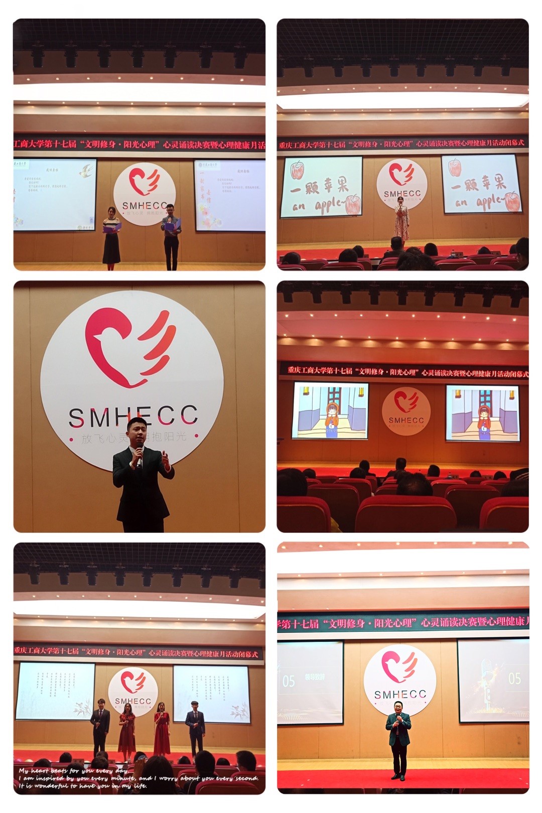 “文明修身·阳光心理”心理健康活动月闭幕式活动共分为五个环节。“心灵诵读”活动决赛中,五组参赛队伍呈现的经典作品丰富多彩,选手们真挚、满怀情感的朗诵赢得了评委及观众的阵阵掌声。“文明修身·阳光心理”活动回顾视频对整个心理健康活动月进行了回溯。在成果展示环节,远离倦怠的《重生》,解压抗抑的《一颗苹果》,心理微课之容貌焦虑等得到了在场师生的积极响应。在颁奖环节,与会嘉宾为“优秀心理委员”代表、“优秀心理工作者”代表、先进集体代表颁奖。