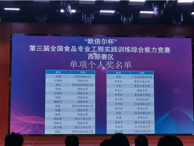 经过两场比拼,由我校环境与资源学院食品科学与工程专业学生程若谷、胡金辉、向思怡3人组成的参赛队(指导老师:周文斌、常海军、尤琳烽)以总排名第4的成绩,荣获西部赛区团队一等奖(排第1),将参加2021年8月中旬在河北农业大学举办的全国总决赛。这也是该院参加该赛事连续三届入围全国总决赛。另外,6名同学获单项个人奖,综合实力位居参赛高校榜首。