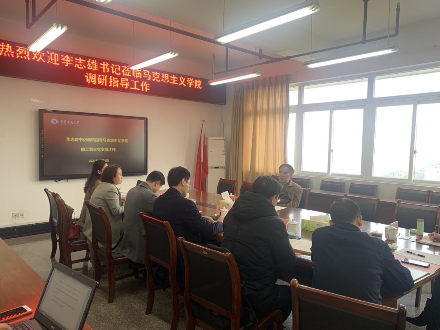 李志雄充分肯定了马克思主义学院基层党组织建设取得的成绩、“十四五”规划整体上的科学性和合理性,重点对所联系的学院教工第三党支部工作进行了精心指导。他表示,将大力支持和关心马克思主义学院教工第三党支部的建设,并就该支部的建设提出三个层面的要求:一是要注重凸显支部书记、支委和业务骨干的领军作用;二是要团结协助,营造全支部党员积极向上的教书育人的浓厚氛围,激发全体党员创建样板支部的工作热情;三是在日常工作中,要着力发挥党员的先锋模范作用,注重先进带动后进,帮扶有困难的支部党员,注重加强教师的思想教育引导工作。他指出,马克思主义学院风清气正,党政同心,学院教学、科研、人才培养等各方面工作取得良好成绩,党建工作取得新进展、新成绩,希望马克思主义学院再接再厉,以创建党建工作标杆学院、党建工作样板支部为契机,打造特色,凝心聚力,促进学院各项工作更上一个新台阶。