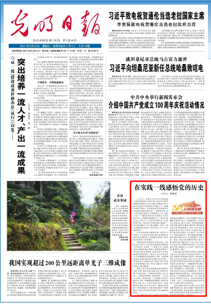 3月24日,《光明日报》在头版以“在实践一线感悟党的历史”为题报道了我校学生学习感悟党史的典型案例。