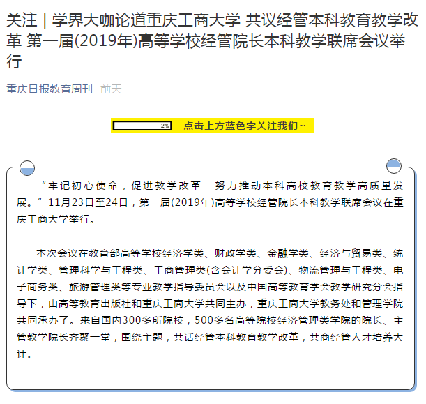 经过两天的热烈讨论,会议达成了初步的共识:一是我国高等学校经济管理教育改革发展已经站在了新时代这一新的历史起点上;二是经管本科教育要全面提高人才的培养能力和培养质量,全面提升服务我国经济社会发展的能力;三是经管高校要积极参与新文科的建设,加强学科内部的融合;四是经管本科人才培养要牢牢抓住教学;五是经管本科教育应积极应对新一轮科技革命和工业革命对人才培养的影响;六是本次会议成立了经管院长本科教学理事会,打造共商、共建、共享的经管教育责任共同体。