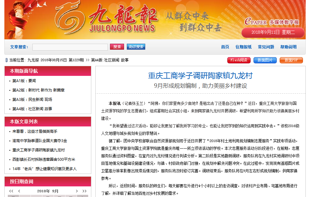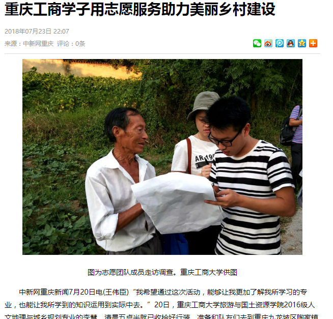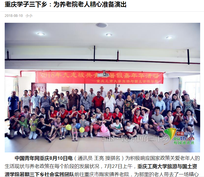 学院师生在九龙坡区陶家镇九龙村和文峰村围绕“青春大学习 奋斗新时代”主题开展的系列活动中志愿团队的突出表现受到了国家级和省市级多方媒体的广泛关注和报道,社会反响热烈。