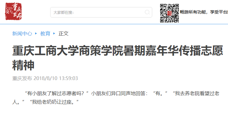 据悉,重庆电视台、中国青年网、人民网、华龙网以及大渝网等媒体均对我院志愿团队进行了大篇幅的关注报道。重庆电视台更是派出记者赴现场进行采访报道;报道发出后,社会反响热烈。