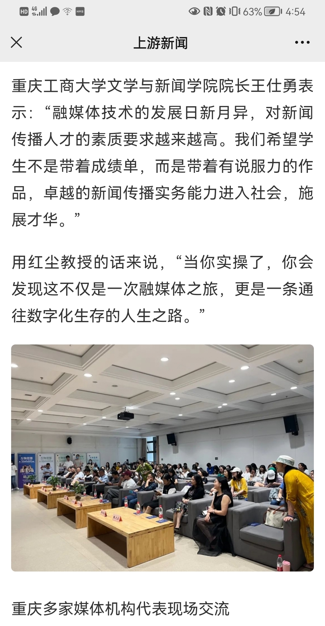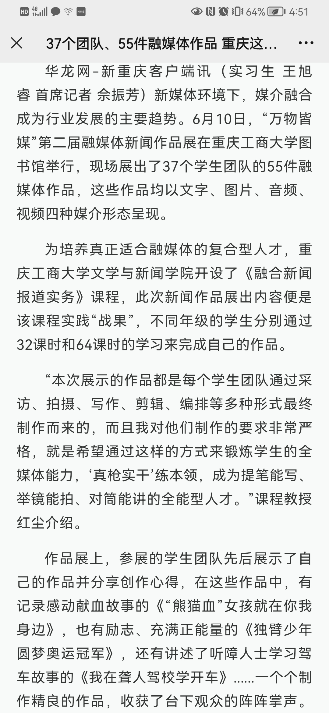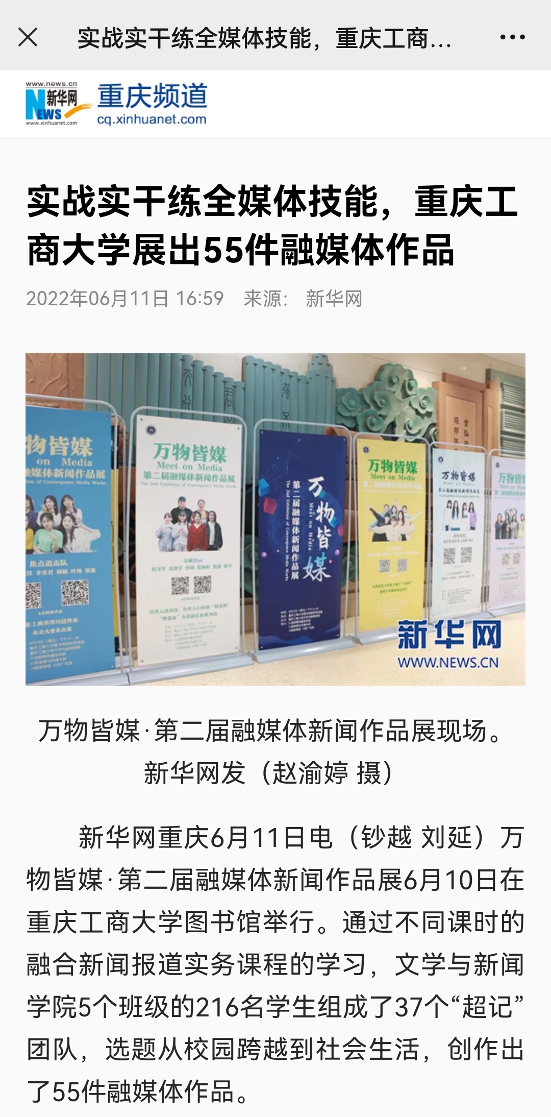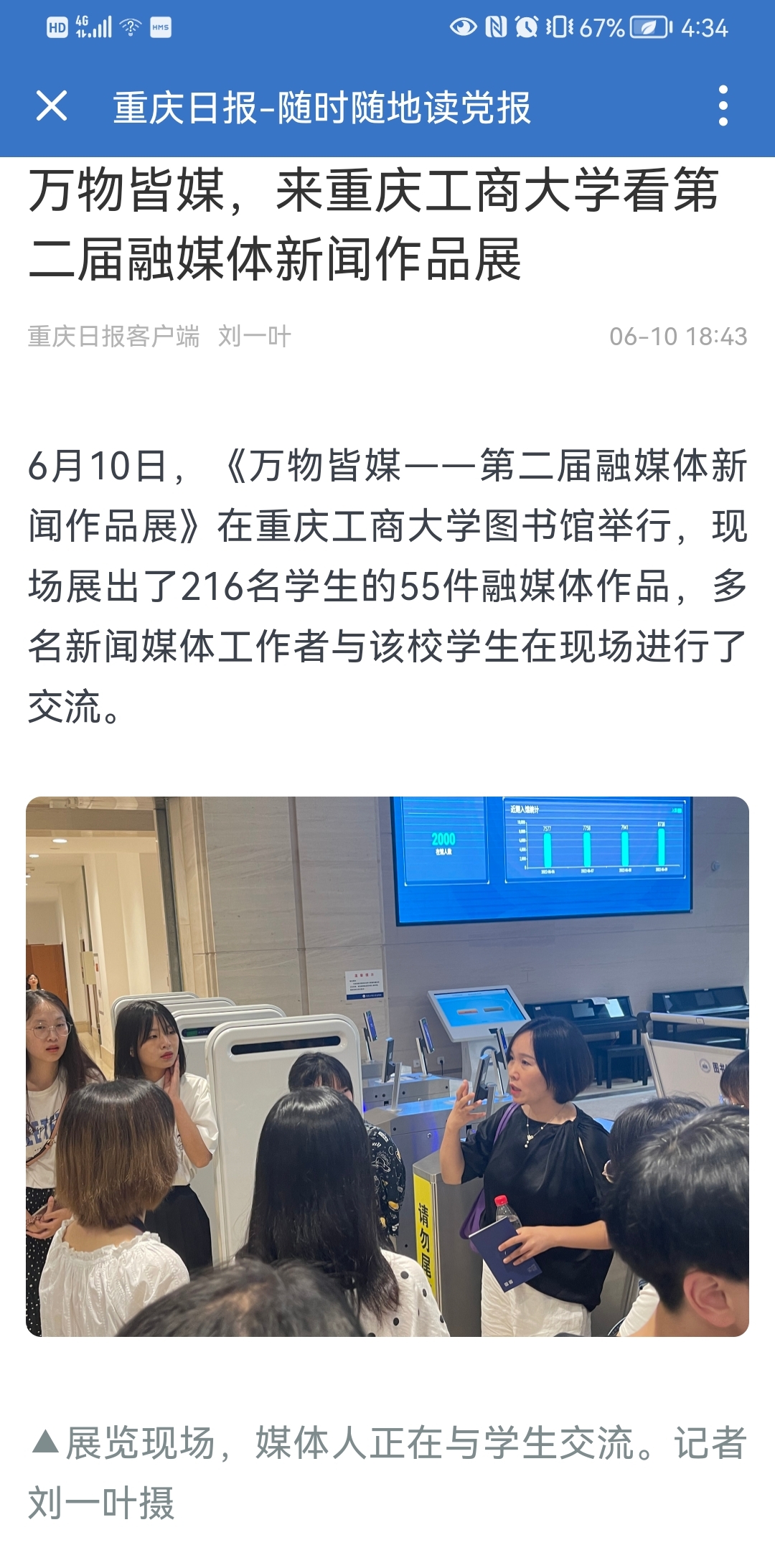 近日,重庆日报、新华网重庆频道等近10家媒体报道我校文学与新闻学院万物皆媒·第二届融媒体新闻作品展。6月10日,重庆日报以“万物皆媒,来开元电竞(中国)官方网站看第二届融媒体新闻作品展”为题报道我校文学与新闻学院万物皆媒·第二届融媒体新闻作品展。华龙网-新重庆客户端以“37个团队、55件融媒体作品 重庆这所高校让学生“真枪实干”练本领”为题报道我校文学与新闻学院万物皆媒·第二届融媒体新闻作品展。新华网以“实战实干练全媒体技能,开元电竞(中国)官方网站展出55件融媒体作品”为题报道我校文学与新闻学院万物皆媒·第二届融媒体新闻作品展。上游新闻以“万物互媒—第二届融媒体新闻作品展,55件作品展示当代大学生创作实力”为题报道我校文学与新闻学院万物皆媒·第二届融媒体新闻作品展。今日头条、网易、澎湃新闻、新浪新闻等媒体以“实战实干练全媒体技能,开元电竞(中国)官方网站展出55件融媒体作品”为题进行转载报道。