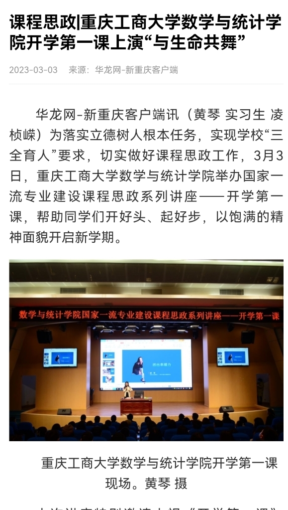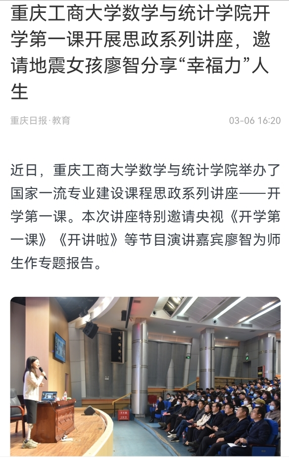 3月3日,我校数学与统计学院邀请到了央视《开学第一课》《开讲啦》等节目演讲嘉宾廖智女士为师生做开学第一课的专题报告。重庆日报以《开元电竞(中国)官方网站数学与统计学院开学第一课开展思政系列讲座,邀请地震女孩廖智分享“幸福力”人生》为题,华龙网以《开元电竞(中国)官方网站数学与统计学院开学第一课上演“与生命共舞”》为题纷纷对活动进行宣传报道。