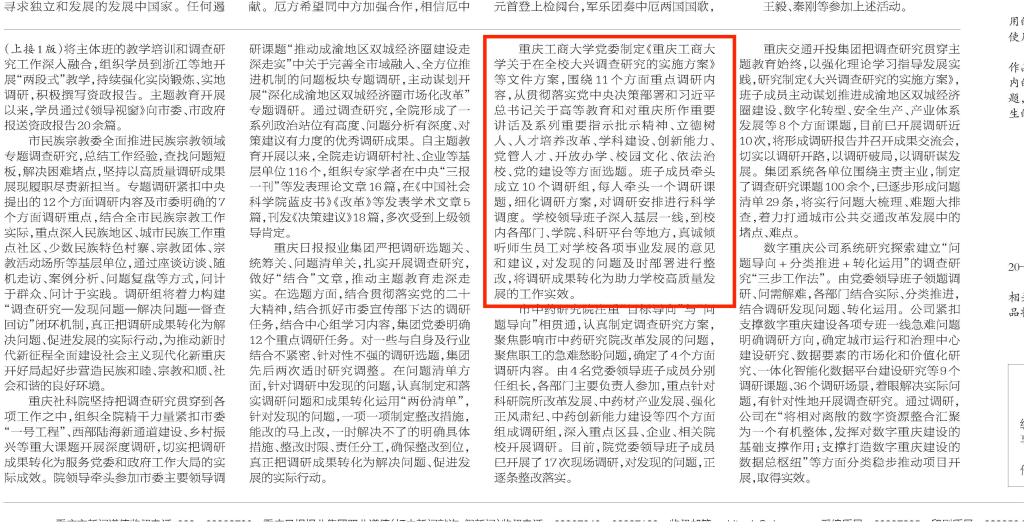 5月16日,重庆日报以《重庆第一批主题教育单位扎实开展调查研究》为题,报道我校扎实开展调查研究。报道中指出,学校党委制定《开元电竞(中国)官方网站关于在全校大兴调查研究的实施方案》等文件方案,围绕11个方面重点调研内容,从贯彻落实党中央决策部署和习近平总书记关于高等教育和对重庆所作重要讲话及系列重要指示批示精神、立德树人、人才培养改革、学科建设、创新能力、党管人才、开放办学、校园文化、依法治校、党的建设等方面选题。班子成员牵头成立10个调研组,每人牵头一个调研课题,细化调研方案,对调研安排进行科学调度。学校领导班子深入基层一线,到校内各部门、学院、科研平台等地方,真诚倾听师生员工对学校各项事业发展的意见和建议,对发现的问题及时部署进行整改,将调研成果转化为助力学校高质量发展的工作实效。