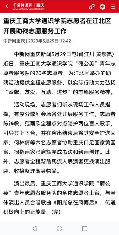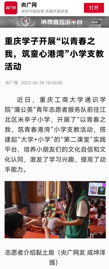 近日,央广网以《重庆学子开展“以青春之我,筑童心港湾”小学支教活动》为题,报道我校通识学院开展小学支教活动;中国新闻网以《开元电竞(中国)官方网站通识学院志愿者在江北区开展助残志愿服务工作》为题,报道我校通识学院志愿者参与江北区助残活动。