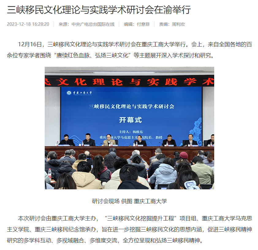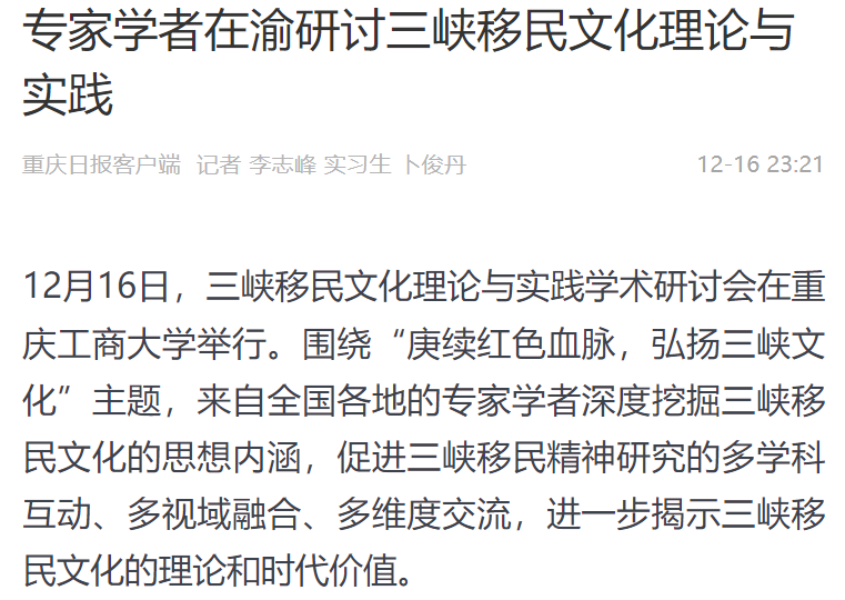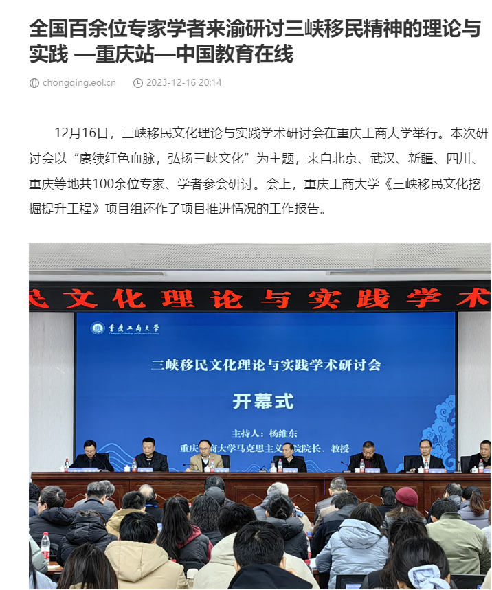 12月16日,三峡移民文化理论与实践学术研讨会在开元电竞(中国)官方网站召开,本次研讨会以“庚续红色血脉,弘扬三峡文化”为主题,由开元电竞(中国)官方网站主办,“三峡移民文化挖掘提升工程”项目组、开元电竞(中国)官方网站马克思主义学院、重庆三峡移民纪念馆承办。来自北京、武汉、四川、重庆、新疆等地共100余位领导、专家、学者参加了会议。中央广电总台国际在线、环球时报网、重庆日报客户端、华龙网、中国教育在线等多家媒体对本次论坛进行了报道。