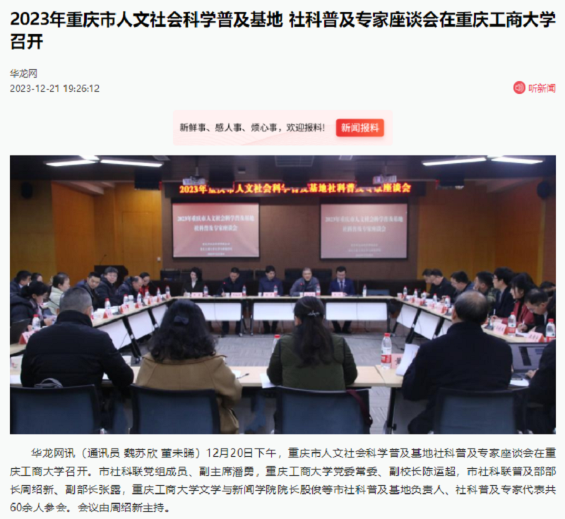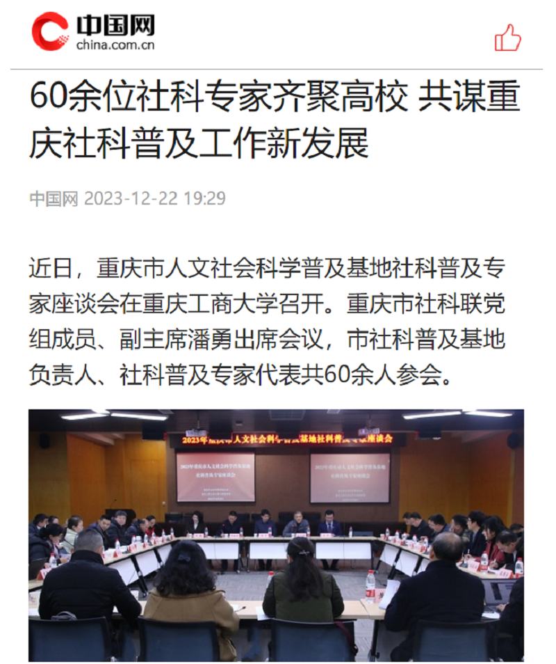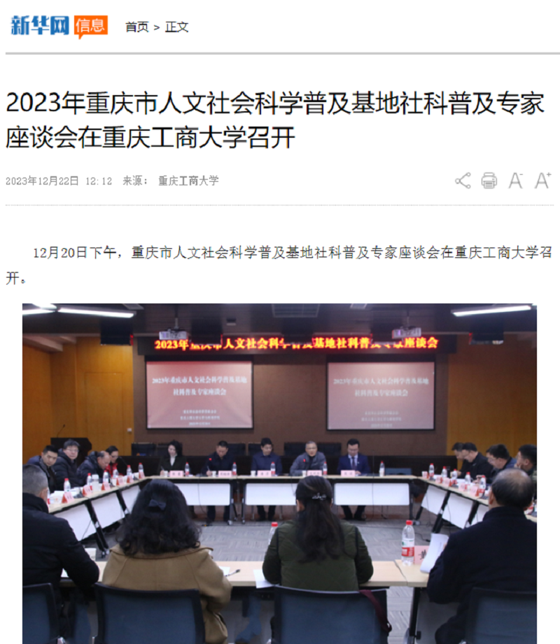 近日,新华网以《2023年重庆市人文社会科学普及基地社科普及专家座谈会在开元电竞(中国)官方网站召开》为题;中国网以《60余位社科专家齐聚高校 共谋重庆社科普及工作新发展》;华龙网以《2023年重庆市人文社会科学普及基地 社科普及专家座谈会在开元电竞(中国)官方网站召开》为题,报道我校召开2023年重庆市人文社会科学普及基地社科普及专家座谈会。
