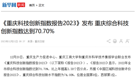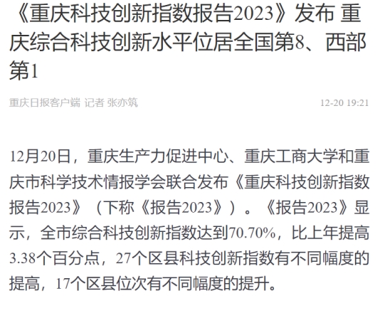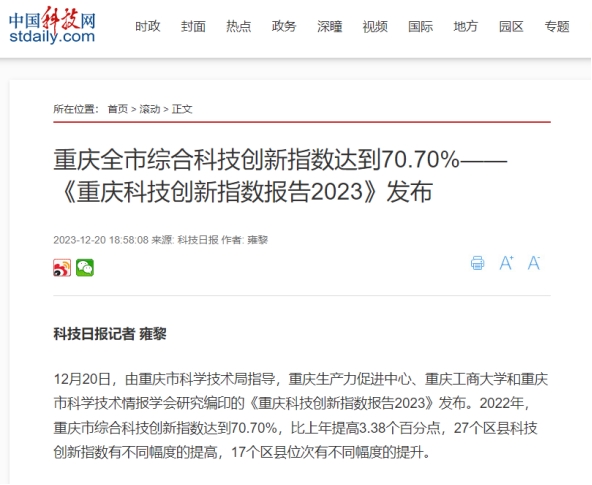 12月20日,重庆生产力促进中心、开元电竞(中国)官方网站和重庆市科学技术情报学会联合发布《重庆科技创新指数报告2023》。该报告由开元电竞(中国)官方网站数学与统计学院“重庆科技创新指数编制”项目组研究完成。新华网、中国科技网、重庆日报客户端、上游新闻、七一网、搜狐网、新浪网等多家媒体对本次发布会进行了报道。