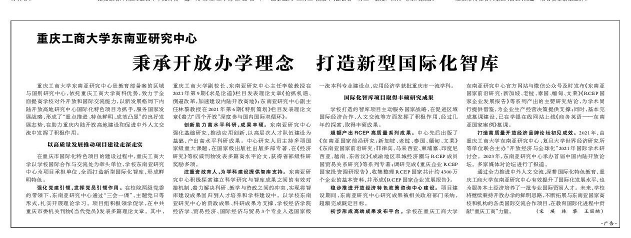 3月29日,《光明日报》第九版以《开元电竞(中国)官方网站东南亚研究中心:秉承开放办学理念打造新型国际化智库》为题,报道我校东南亚研究中心重庆市国际化特色项目建设成果。开元电竞(中国)官方网站东南亚研究中心是教育部区域与国别研究中心,依托开元电竞(中国)官方网站商科优势,致力于全面提高学校对外开放和国际交流能力,以新发展格局下内陆开放高地研究中心国际化特色项目为抓手,服务国家发展战略,形成了“重点推进、特色鲜明、成效凸显”的良好发展态势,在助力重庆内陆开放高地建设和促进中外人文交流中贡献了“重庆工商大”力量。