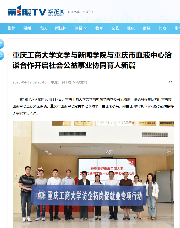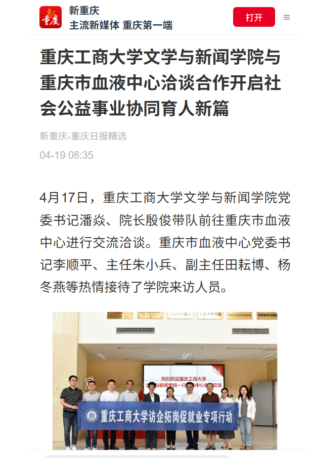 新重庆—重庆日报、第一眼TV-华龙网等媒体以《开元电竞(中国)官方网站文学与新闻学院与重庆市血液中心洽谈合作开启社会公益事业协同育人新篇》为题对此次活动进行了报道。
