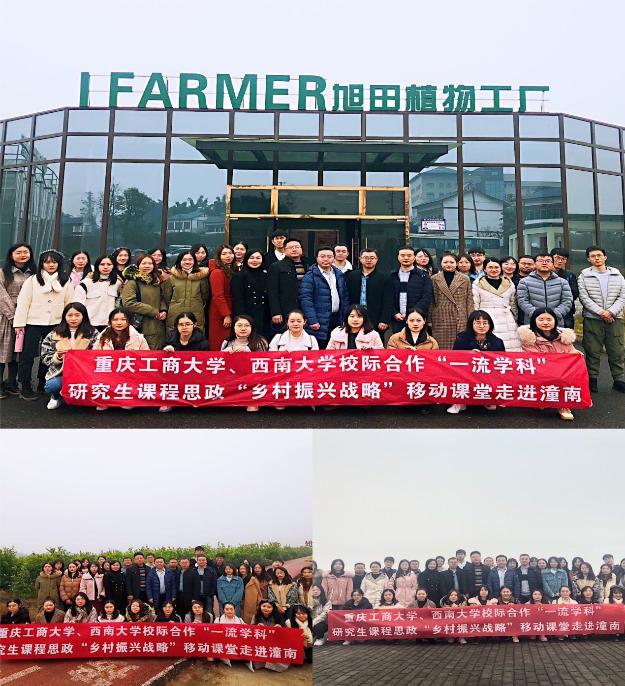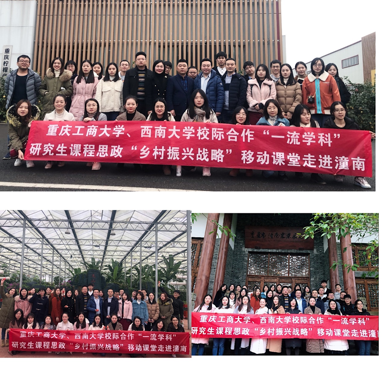 为将思想政治教育内容与专业知识技能教育内容有机结合,切实发挥重庆市一流学科研究生教育的思想政治教育功能,强化研究生“四个自信”,培养具有爱国主义情怀、能够对国家大政方针和国家战略深刻认识与理解、拥有为祖国贡献力量积极性和意愿度的高素质高层次研究生人才,我校立足“应用经济”重庆市“一流学科”,以重庆市第六批研究生优质课程《中国区域经济问题专题》(2019069)建设项目为依托,整合校际资源,联合西南大学,推动重庆市一流学科研究生教育课程思政建设与发展, 2019年12月11日,我校与西南大学校际合作“一流学科”研究生课程思政“乡村振兴战略”移动课堂走进“柠檬之都”潼南。我校研究生院副院长王燕教授,研究生课程思政精品在线课程建设项目教学团队师资代表、艺术学院院长殷俊教授,黎毅副教授以及西南大学研究生院委派的代表西南大学经济管理学院院长助理、博士生导师刘新智教授,以及来自两校区域经济、国民经济、数量经济、国际贸易、产业经济学等专业32名研究生代表参加了此次移动课堂。