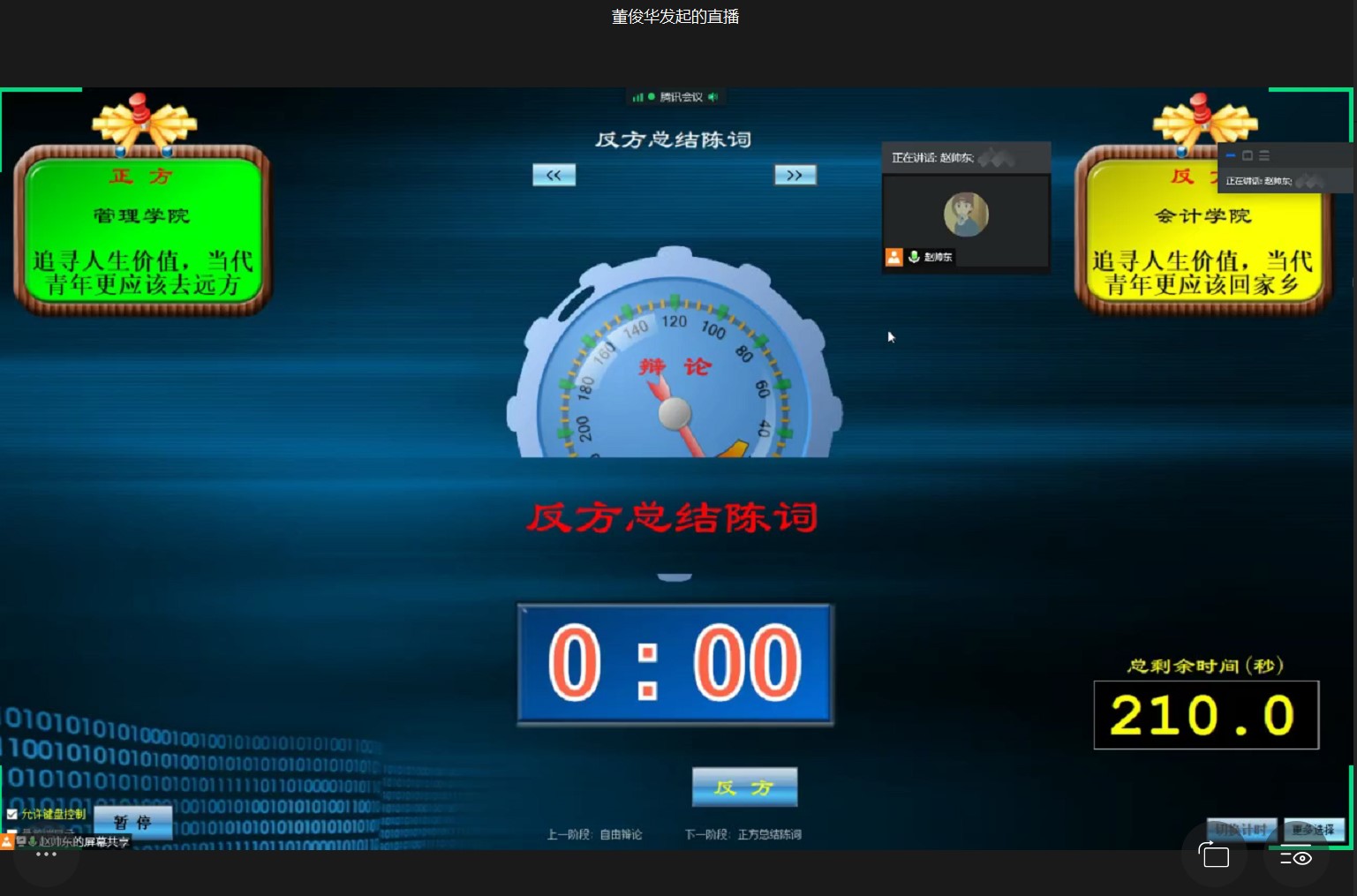 6月12日下午,由校团委主办、校学生会承办的第十八届“工商杯”辩论赛总决赛顺利举行。本次比赛通过腾讯会议直播,企业微信平台转播的方式进行,中南财经政法大学法学院副教授徐小奔、西南政法大学辩论队主教练景轶、世界华语辩论锦标赛联合主办人于强、开元电竞(中国)官方网站艺术学院院长殷俊、开元电竞(中国)官方网站MBA教育中心主任任毅担任本次比赛的评委。