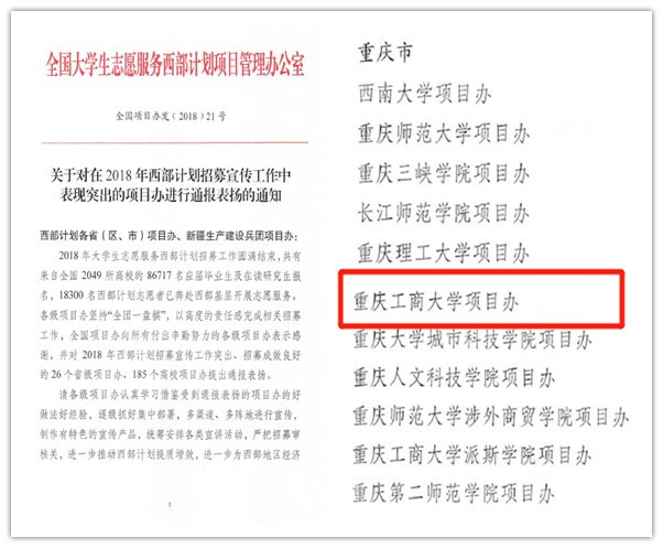 11月16日,全国大学生志愿服务西部计划项目管理办公室下发了《关于对在2018年西部计划招募宣传工作中表现突出的项目办进行通报表扬的通知》,对包括我校在内的185个高校项目办提出通报表扬。11月20日,团中央学校部、全国学联秘书处下发了《关于2018年全国大中专学生志愿者暑期“三下乡”社会实践活动通报》,我校校团委获评全国优秀单位(全国共评选300个)。